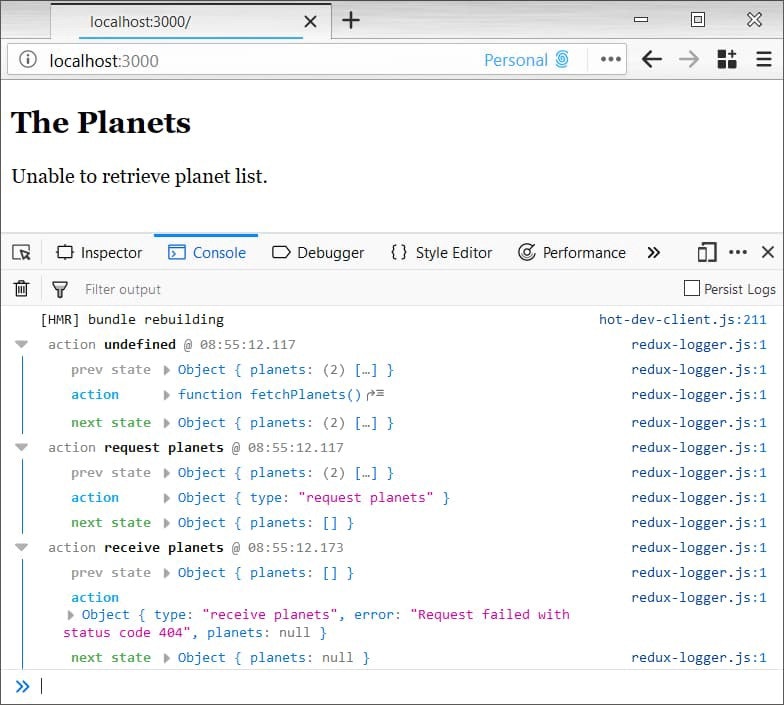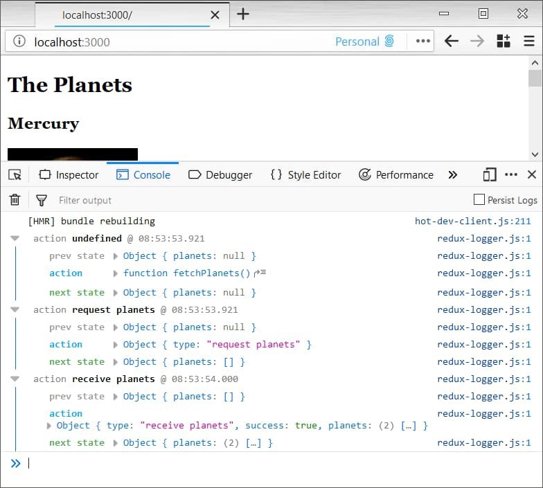 The request gets triggered by the component’s componentDidMount method which then fires fetchPlanets. To help you visualize the result, here is the working demo: